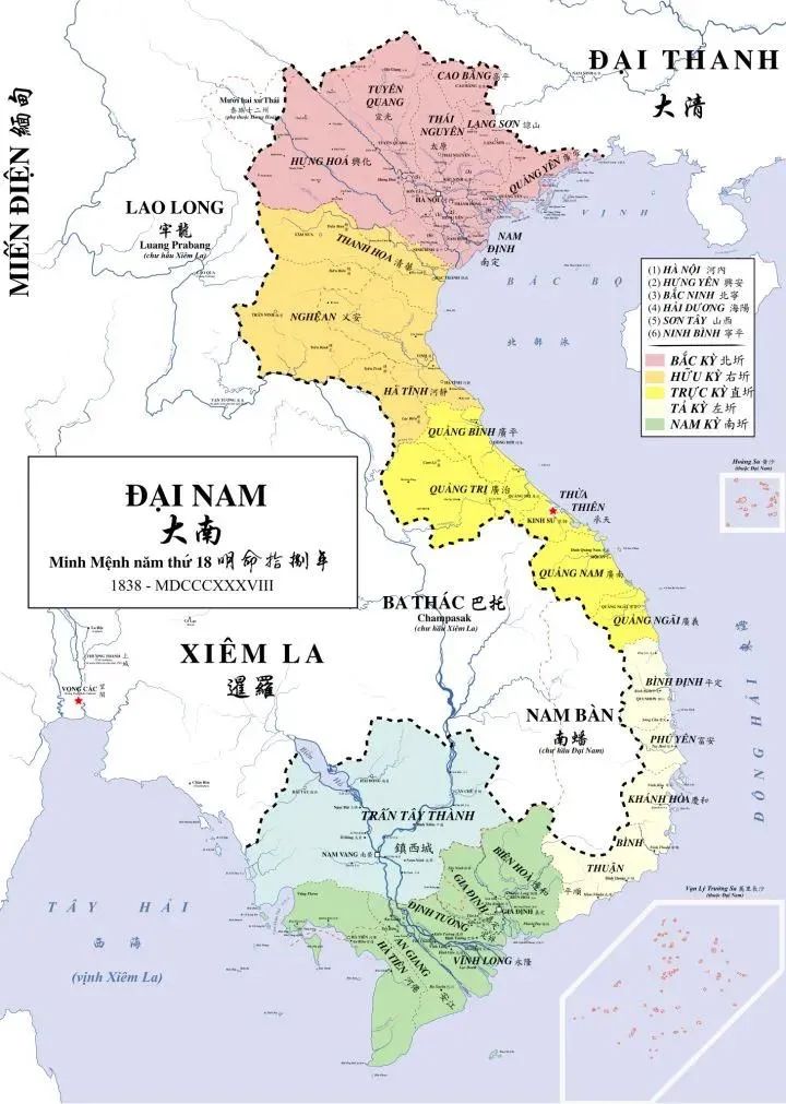 明命帝在位时(1820~1841年),越南疆域大约如图所示,比今日越南大。