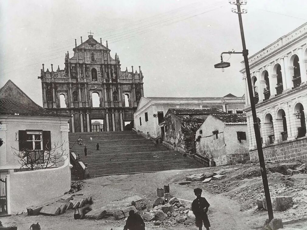 1900年,澳门大三巴牌坊。大三巴牌坊,其正式名称为圣保禄大教堂遗址,一般称为大三巴或牌坊,是澳门天主之母教堂(圣保禄教堂,于1580年竣工)正面前壁的遗址。大三巴牌坊是澳门的标志性建筑物之一 ,同时也为“澳门八景 ”之一。2005年与澳门历史城区的其他文物成为联合国世界文化遗产。