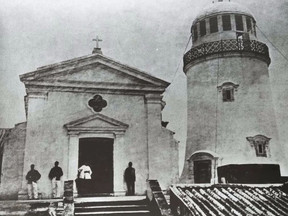 东望洋灯塔及小教堂,约1880年。东望洋灯塔,是位于中国澳门东望洋山山顶上的灯塔,是东望洋炮台的一部分,是东望洋山有三大名胜古迹之一;在1992年,更被评为澳门八景之一;在2005年作为澳门历史城区的部分被列入世界文化遗产名录内。
