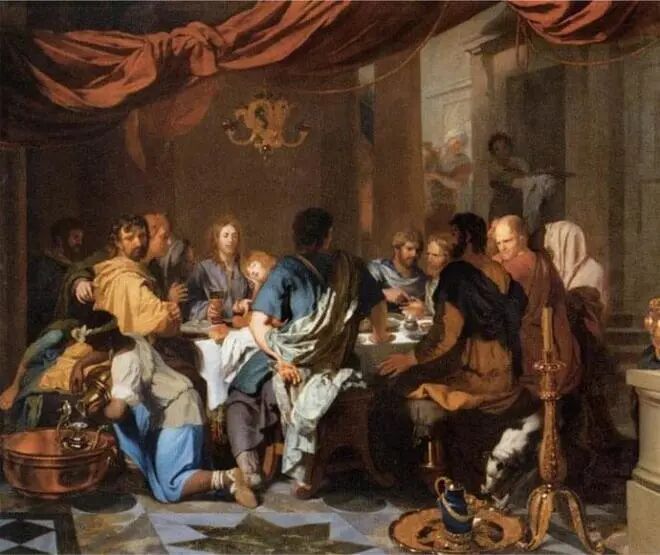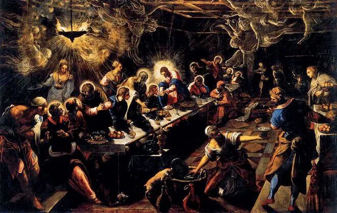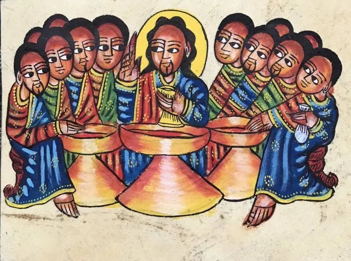在此,我搜罗了各种版本的《最后的晚餐》,其中包括中国版的《最后的晚餐》、埃塞俄比亚版的《最后的晚餐》,对于这两幅画,读者可能会觉得很违和,其实应该淡然视之,因为大量基于欧洲视觉本位创作的《最后的晚餐》,和事实上或者传说中的“最后的晚餐”场景也是相去甚远。值得一提的是,在下列画作中,丁托列托的《最后的晚餐》,被称为“尊经版”,也就是最接近于当时犹太社群状况的版本。
