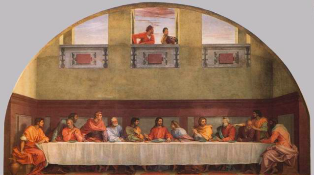 相比之前的画家,达·芬奇的高明之处就在于他颠覆了过往的传统。在此之前,“最后的晚餐”为主题的画作,有一个鲜明之处,就是叛徒犹大形象是特殊化处理的,他要么没有头顶光环,要么是神情猥琐,要么是背对姿势,或者是个吃货。但在达·芬奇的《最后的晚餐》中,包括犹大在内的十二使徒全员都位于与画面平行的桌子的同一侧,分别围坐在耶稣的左右。使徒们分为三人一组,每组人像占据均等的画面空间。如此犹太就变成了一个“达·芬奇密码”式的存在(至少需要花费心思去辨认)。当然了,达·芬奇作品的特殊之处,肯定不限于此。在整个画面结构中,耶稣左右手展开,形成沉静展开了一副左右对称的均衡构图,通过使徒们各式各样的表情和动作,形象地呈现了耶稣内心的平静与使徒们内心的躁动,则是这幅作品最精妙之处。