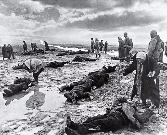1942年1月,在新解放的克里米亚凯奇市,两个月前纳粹死亡小队在这里囚禁了镇上的7000名犹太人。巴特曼多年后回忆说:“他们把所有的人都赶到了一个反坦克沟,然后开枪扫射。”一位老年人伸出的四肢冻结在死前最后一刻恳求,一些聚集的城镇居民沉浸在巨大的悲伤里,巴特曼斯见证了纳粹分子在犹太人身上犯下的种种罪行,同时也展现了犹太人民在战争中所产生的巨大的痛苦。