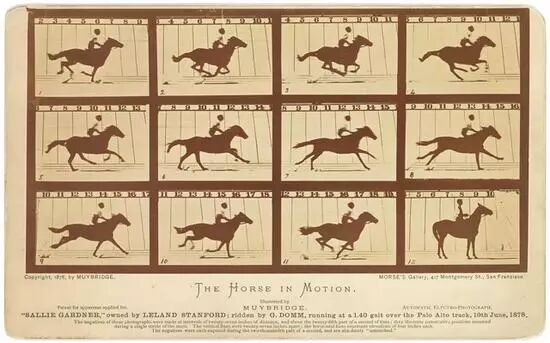 1878年6月19日,爱德华·爱布里奇用了 12 台双镜头照相机列成一排,对一名骑手骑马快速奔跑的瞬间进行拍摄,结果,不但证实了马在快速奔跑的瞬间4条腿是同时离开了地面和马腿的各种姿态的问题,结束了数世纪以来长期困惑画家和艺术家们的难题和争论。另外,他拍下的连续性的照片 “骑手和奔跑的馬” 成为人类史上第一部“电影”,这部“电影” 实际上是將一系列照片放在一起运行,从而产生移动的效果。他的开创性工作和重大的发明的结果,终于引领人们跨入了“电影和电影摄像的时代 ”。