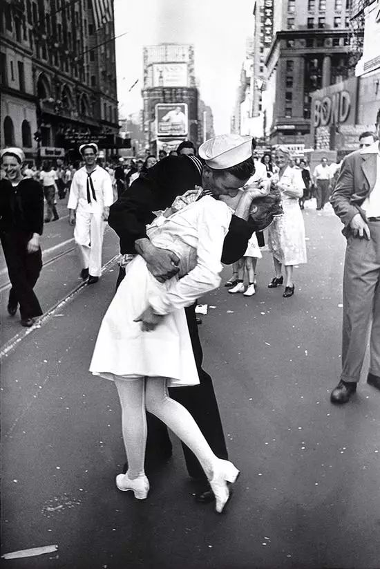 Alfred Eisenstaedt 是《LIFE》杂志著名摄影师之一,他的任务就是“寻找和捕捉故事”。当1945年8月14日第二次世界大战结束时,艾森斯塔特发现时代广场上的欢乐的人群。他面前的一个水手抓住一个护士,搂住了她的背并热吻了她。Eisenstaedt 抓拍了这张充满热情的照片,这张照片已成为20世纪最著名的图片之一,成为我们对历史上这一变革时刻的集体记忆。