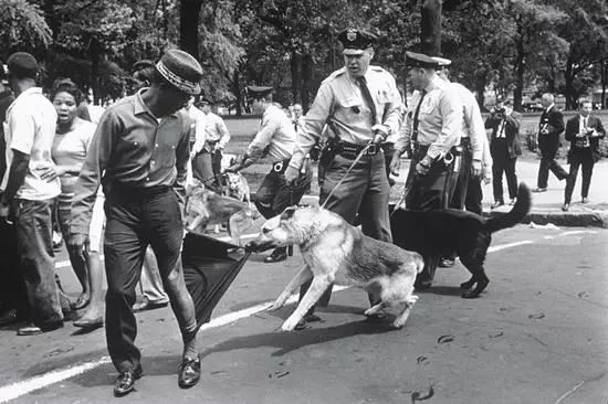 1963年夏天,伯明翰的黑人居民和他们在民权运动中的盟友反复与白色权力结构发生冲突,摄影师查尔斯·摩尔是一个土生土长的阿拉巴马人,他对以法律和秩序的名义对非洲裔美国人的暴力举动感到震惊。这张照片是一个警犬撕裂成一个黑色的抗议者的裤子的一瞬间,这张照片表现的内容让民众镇静,直接推动了1964年《民权法案》的通过。