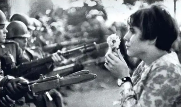 1967年10月21日,年仅17岁的女孩Jan Rose Kasmir 走下大巴车,随着人群进入抗议的队伍,最后来到队伍的最前面。她面对的,是一排荷枪实弹的军警。