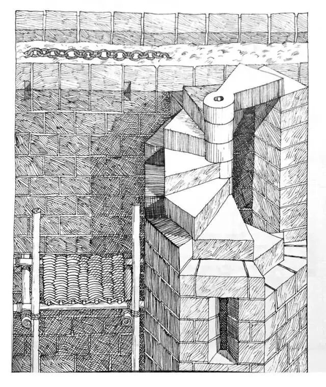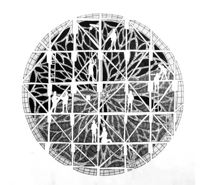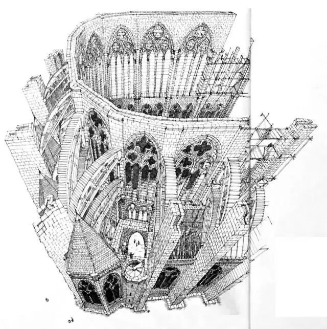 每一个花窗,则是几百块石质构件拼成的,相互之间用铁件固定(请注意图左上的那几个人影,有了他们,你才能明白作者是在画鸟瞰图,也才知道这个窗有多大吧)。