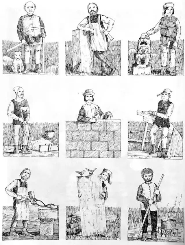 接下来就是众多大师(master)的登场(从左到右,从上到下依次是):采石大师、切石大师、雕石大师、灰泥制作大师、泥瓦匠大师、木匠大师、铁匠大师,屋顶工大师和玻璃大师……原谅我把这个词用得这么滥,看过后面,感觉这些人还是称之为“专业负责人”或是“某专业公司老板”比较合适,因为他们每个人都能带领一个几十甚至几百人的团队,手下还有许多学徒,而真正干活的是一些雇来的体力劳动者,所以……那些民众自发建设之类的话就别多想了。