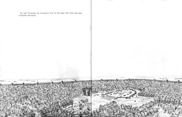 老教堂已经被清理干净了,除了埋着老主教的地下室全都拆掉,工人在基地上画出歌坛(choir)和后殿(半圆室)的位置,然后开始挖坑。基础的墙非常厚的墙,又要依着老地穴的位置,足有25英尺(7.6米)深。