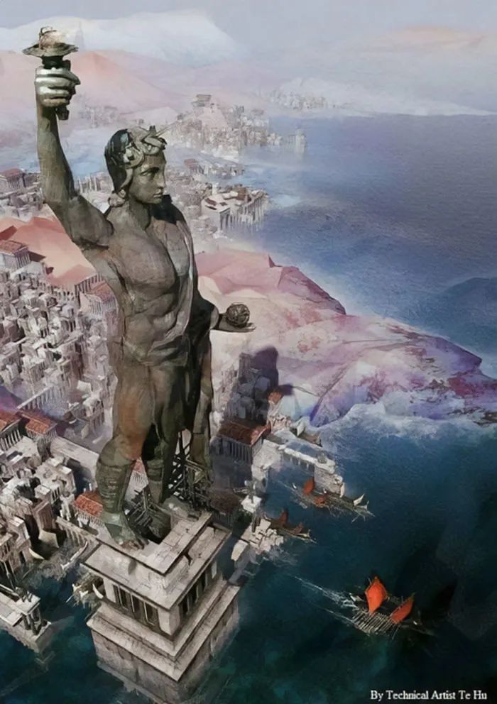 这是罗得岛巨像的精确再现,建于公元前 226 年在罗得岛(希腊),并于公元前 292 年被地震摧毁。它被认为是古代世界七大奇迹之一