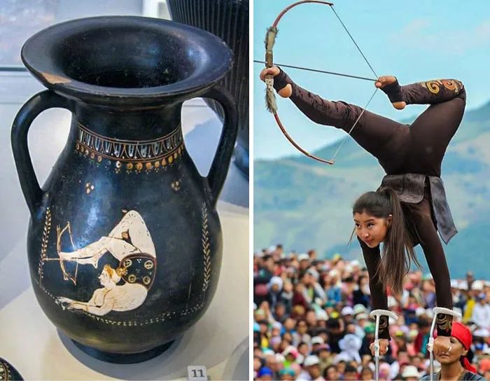 第二张图片显示了一名杂技弓箭手,在吉尔吉斯斯坦举行的 2016 年世界游牧运动会上。