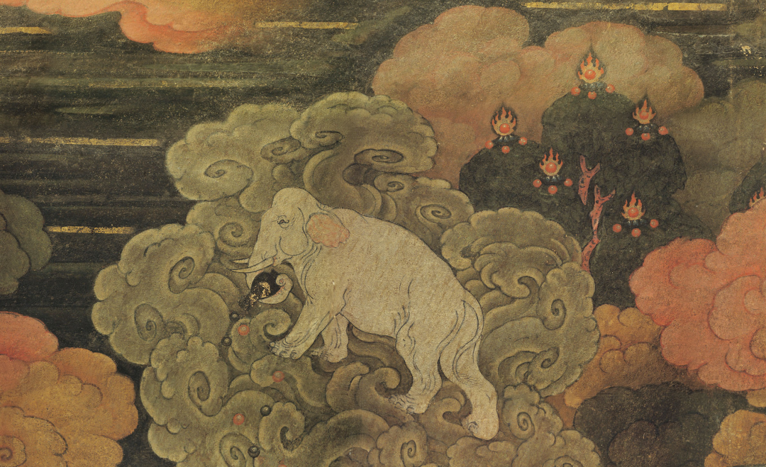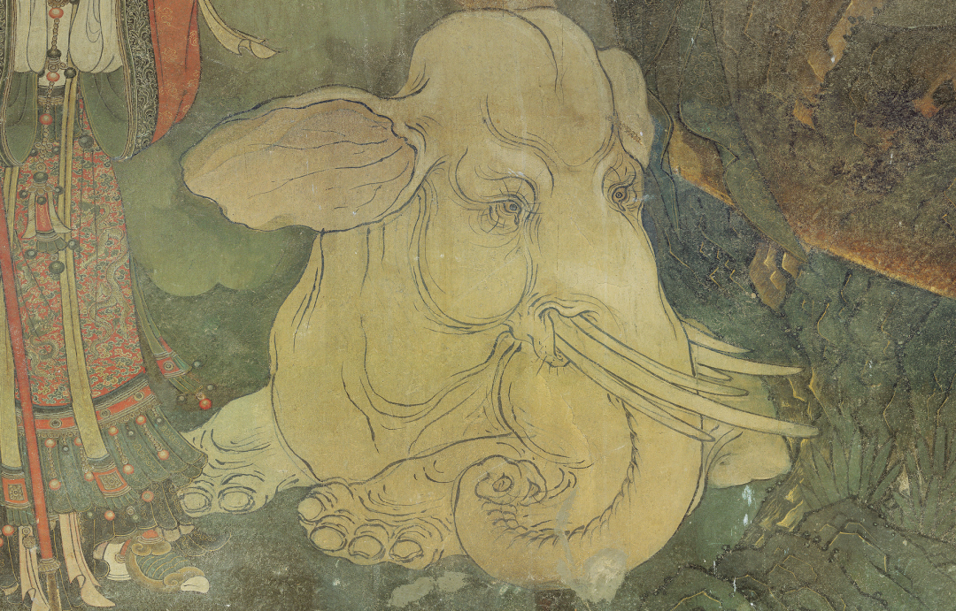普贤座下六牙白象,只用淡墨一勾,从笔势的顿挫转折中,巧妙地表现了象体的蜷伏着的沉重厚硕的质感。