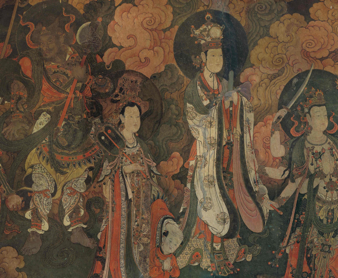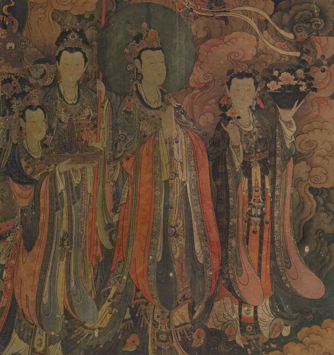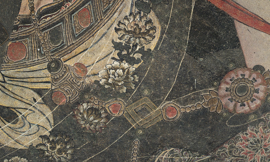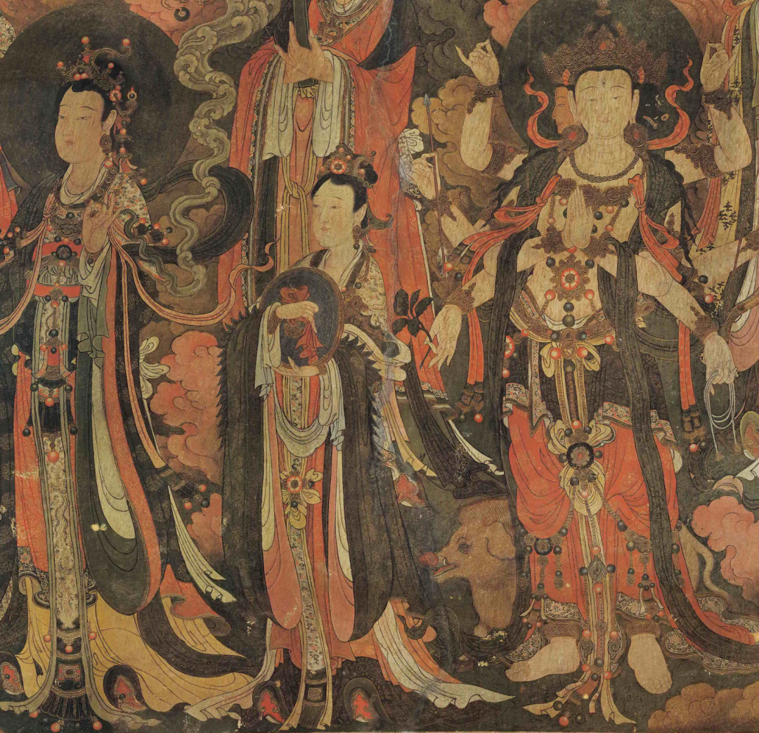 仅在菩提树天的服饰中就出现了凤舞、龙翔、牡丹、菊花、云团等近十种不同的纹样形式。