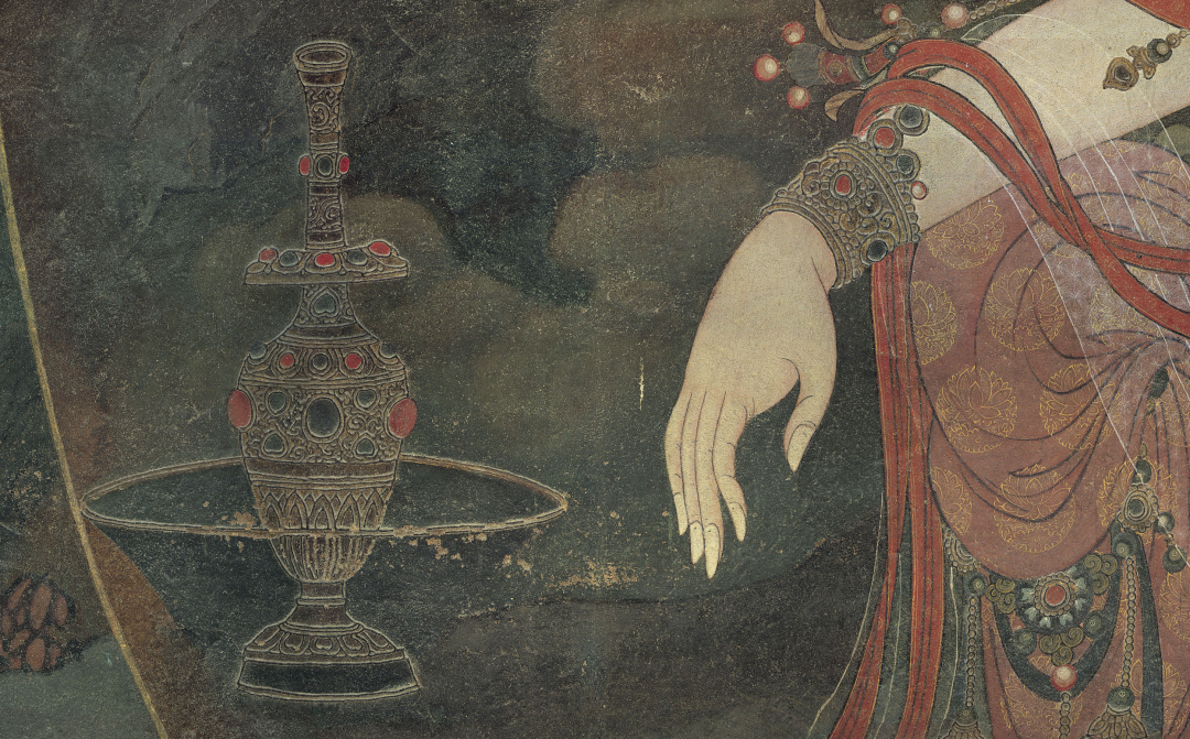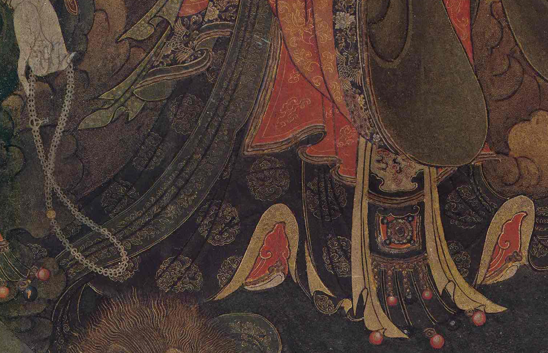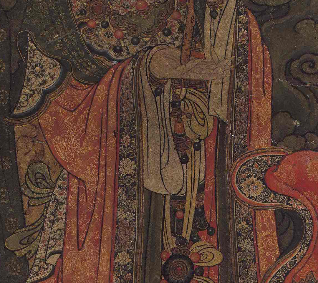 “水月观音”中所有的轮廓线均采用“沥粉堆金”的画法勾勒,每一条轮廓线都独具浮雕般的立体效果,整个画面璎珞缤纷、光华灿烂。