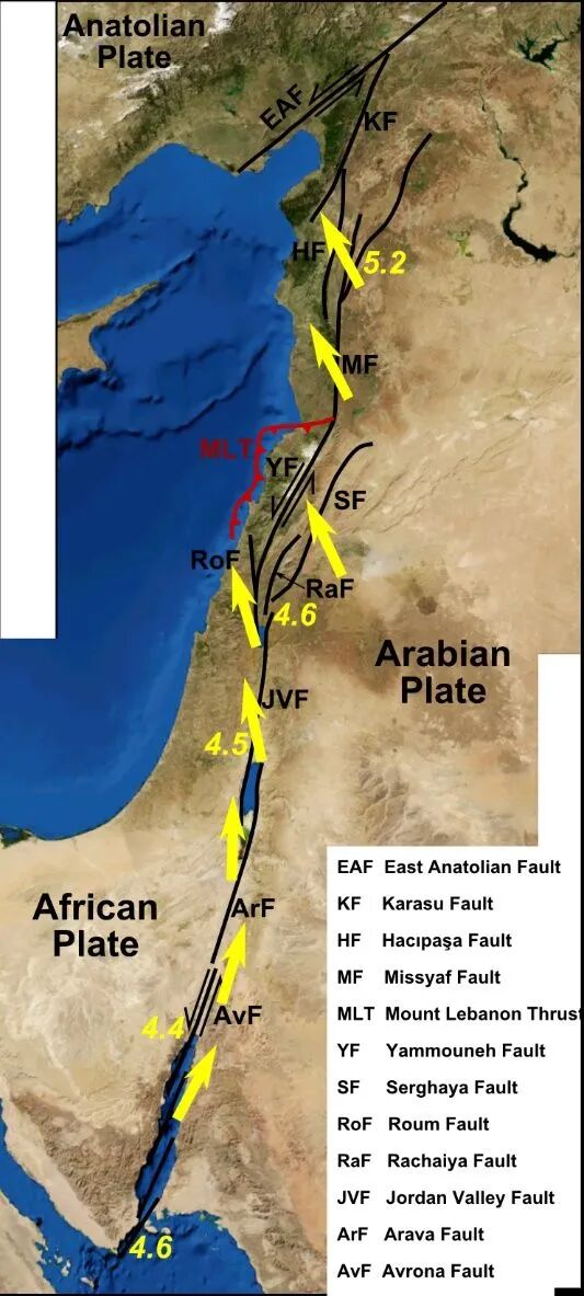 与平原和山脉相平行的,是一条狭长的谷地,这条谷地也是东非大裂谷的东北段,今天也叫死海(谷地)裂谷(Dead Sea Transform or Rift)。整个裂谷并非连续整体,而是一系列石灰岩高地和曾一度沼泽化的肥沃低地组成的地堑链,中间还有河流和湖泊发育。裂谷北部是加勃谷地(Ghab valley),中部是将黎巴嫩山脉与反黎巴嫩山脉分隔的贝卡谷地(Beqaa Valley),再往南胡拉谷地(Hula Valley)将加利利山区与戈兰高地隔开。著名的约旦河发源于此并向南经过胡拉湖注入加利利海(Sea of Galilee)。裂谷继续向南为狭长的约旦河谷地,约旦河(River Jordan)经此注入死海。自死海向南,是荒芜的阿拉伯谷地(Wadi Arabah)随后直到亚喀巴湾(Gulf of Aqaba)。在地质作用形成了裂谷之后,自然水体进而促进了谷地的形成,并为之提供水源。今日的加利利海和死海便是古利散海的遗存,约旦河与奥龙特斯河泛滥所形成的沉积物与冲积扇,为农业提供了土地条件,使这片谷地迎来了生机。
