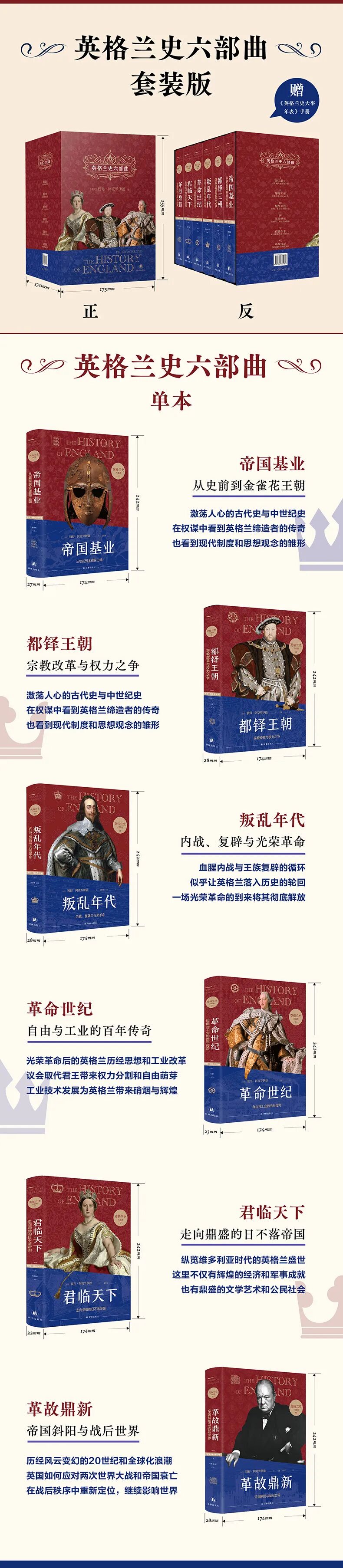 为满足不同读者的阅读和收藏需求,中文版既推出可以分卷购买的单册,也提供可整套购买的全集。全集附赠《英格兰史大事年表》手册,帮助读者更好地贯通大英帝国近两千年的兴衰史。