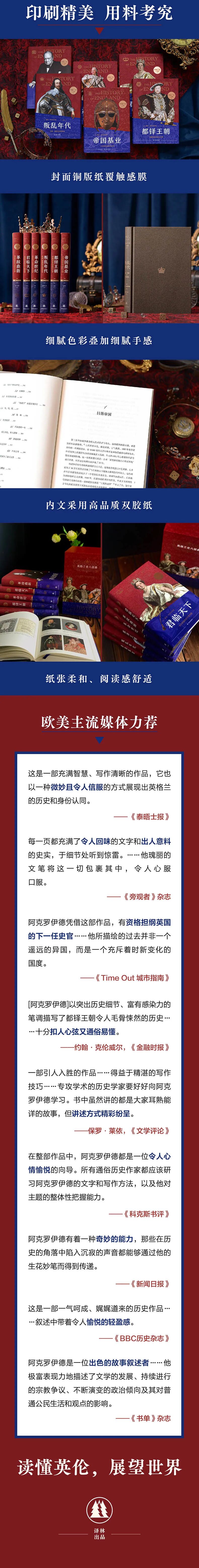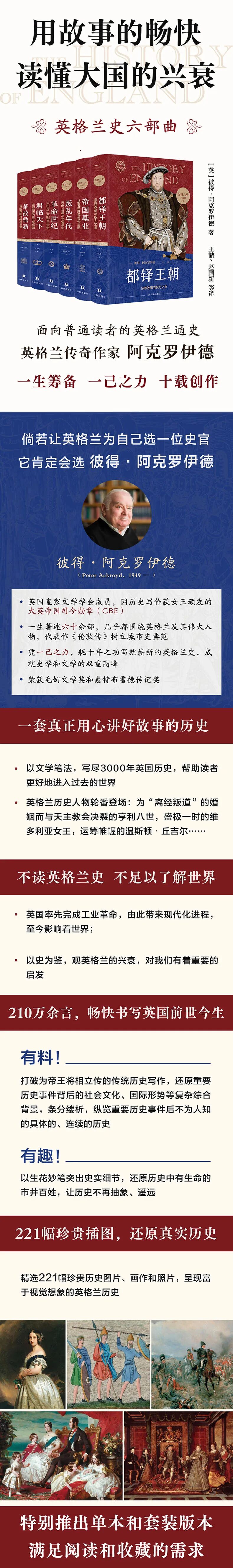 《泰晤士报》《观察家》《旁观者》《图书馆周刊》《书单杂志》《科克斯书评》《每日快报》齐声赞誉。六卷中文版精选221幅历史画作和照片,直观呈现富于视觉想象的英格兰历史。阿克罗伊德既是精于叙事的作家,也是史学功底深厚的历史学家,他以作家独有的细腻笔触,在把英国历史娓娓道来的同时,保证史实的严谨性和专业性。