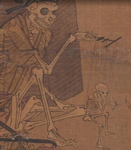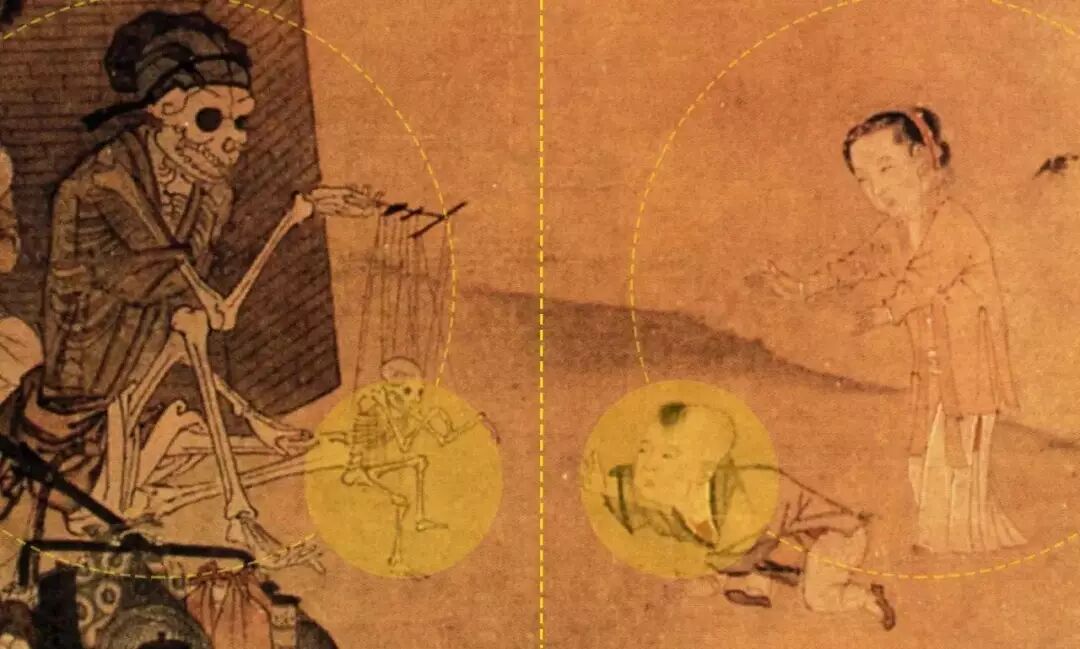 画面中央是一个大骷髅席地而坐,用悬丝在操纵着一个小骷髅。这是宋代市井木偶表演形式——悬丝傀儡演出,整幅画诡异的根源就在这:操纵小骷髅的不是街头艺人,而是一个大骷髅。