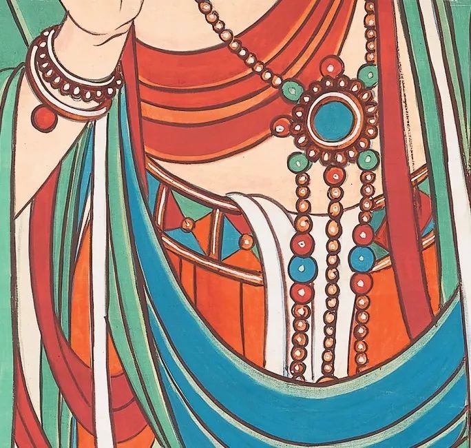 衣服纹饰色彩多用石青、石绿、土红色,菩萨身上璎珞珠宝点缀,画面华丽而高贵。宗教壁画中的人物衣冠服饰,是当时社会人物日常装扮的现实反映,并随时代的改变有所变化。唐朝初期,妇女服饰多小袖窄衣,外加半臂,肩部绕有披帛,风格较为简约。至中晚唐日趋呈现衣裙宽肥,褒衣博带的特点。