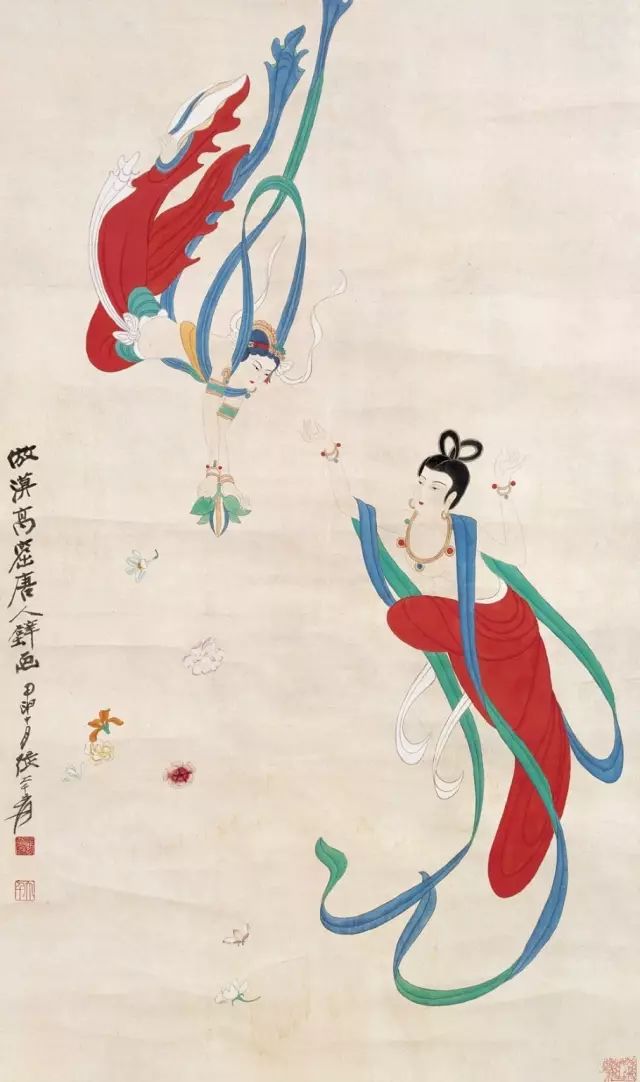 敦煌石窟是举世瞩目的世界文化遗产,而张大千正是对敦煌艺术进行全面整理、临摹、学习、继承和发扬的第一人。1941年至1943年,张大千在敦煌共临摹作品276件。这一经历,使得张大千的艺术创作产生了极大的转变,人物形象更加饱满生动,线条流畅而富于变化,赋色浓艳又不失端庄,与单纯的文人画风拉开了距离。