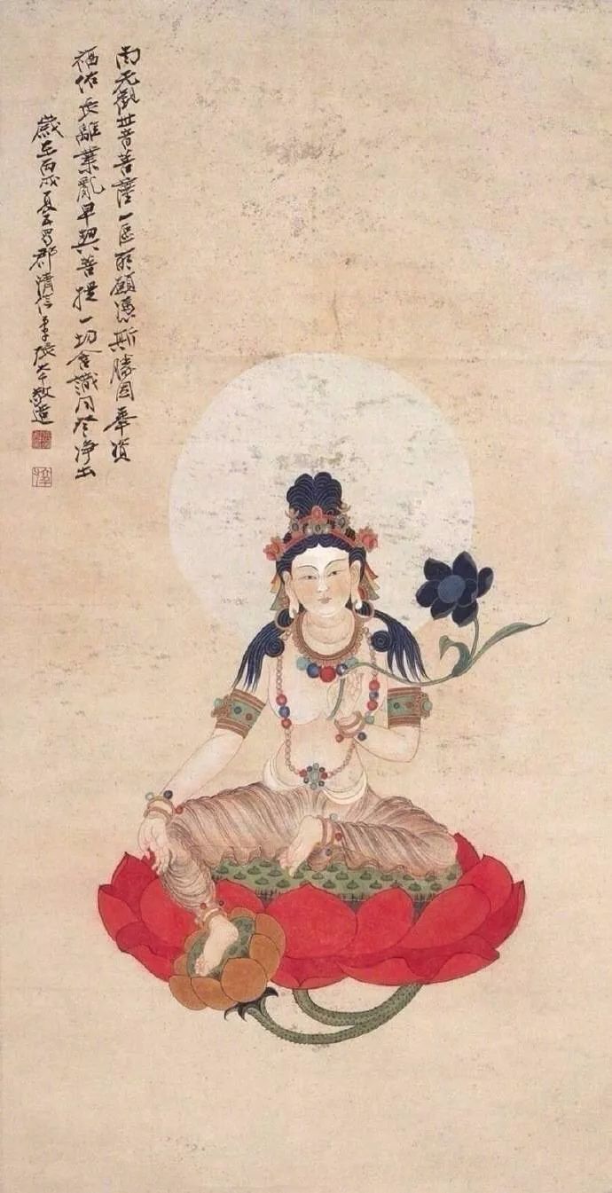 图中所临大士以宝缯束高发髻,头后有光晕染,蓝色长发及腰,面相方圆,眉目细长,高鼻,唇边上下有胡须,长垂耳珰。上身袒露,斜披络腋,绿色腰彩打结于腹前,下身着红色轻薄附体长裙。戴项链,手臂饰臂钏手镯,身上璎珞珠宝点缀,装扮华丽。右臂微向上曲于胸前,左臂微曲下垂提净瓶。衣带飘动,身体右侧,注目眺望,赤双足站立于红色莲座之上。身体比例匀称,肌肉质感强烈。右侧有三株宝花,绿叶对称,顶开红花。画面艳丽生动。