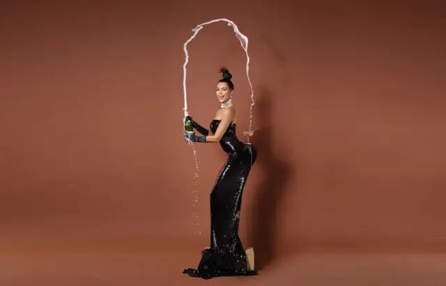 她微笑看着镜头,用屁股顶着高脚杯,香槟如同喷涌的喷泉划着抛物线落入酒杯。