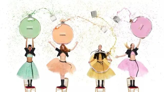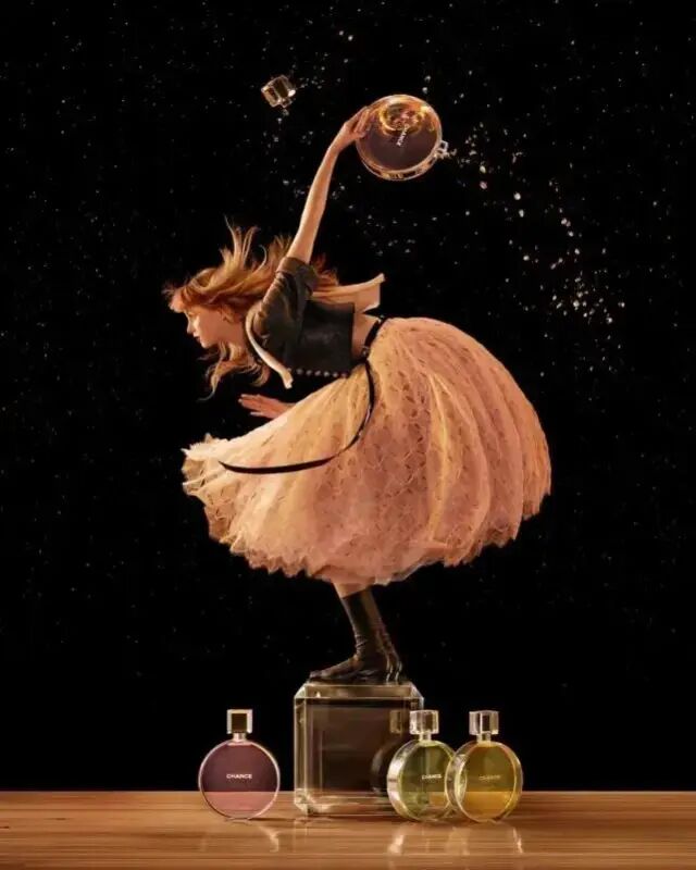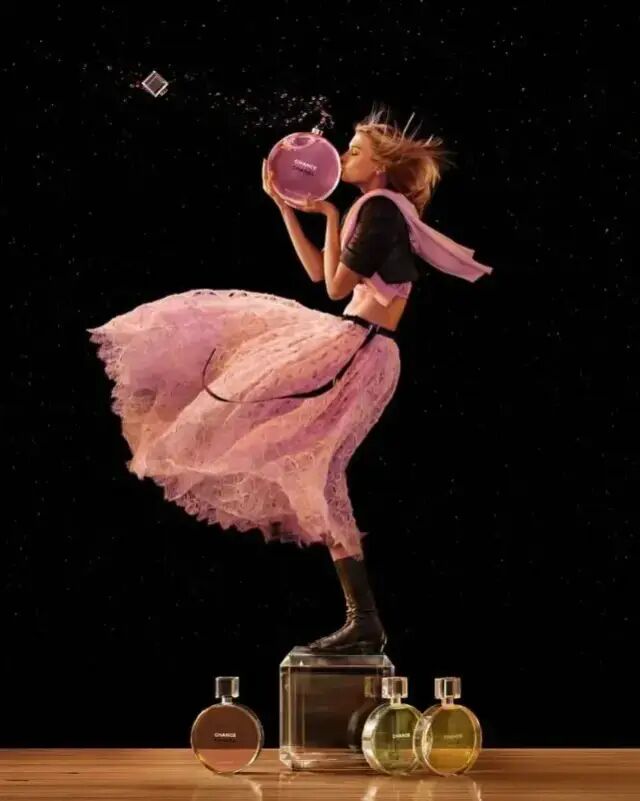 例如他为香奈儿拍摄的系列香水广告,小小的香水瓶一会儿化身成为模特亲吻的水晶球,一会儿成为俯身抛出的保龄球,充分体现了Goude不落俗套的想象力。↓