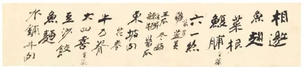 题识:相邀 大杂烩、鱼翅、菜根、鳆脯生菜、六一丝、莴苣韭黄、王瓜冬菇、辣豆瓣酱瓜、东坡肉、花卷、牛力脊、大四喜生菜、豆沙饺、鱼麵、水铺牛肉 。