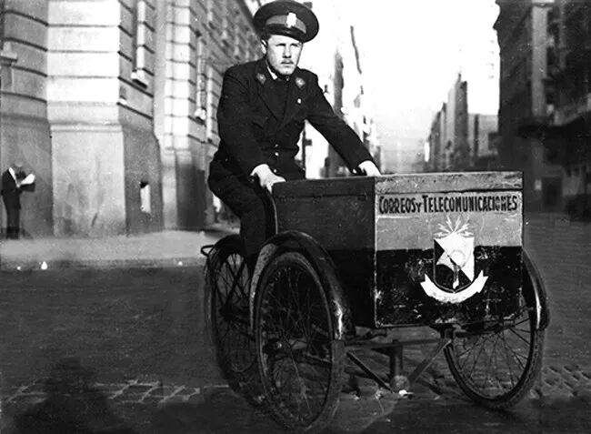 一名邮递员在布宜诺斯艾利斯的街道上,时间大约在1930年