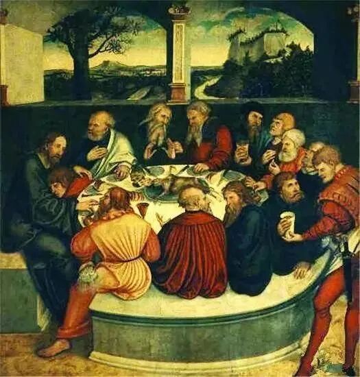 复古派的像是马蒂亚斯•格吕内瓦尔德的《最后的晚餐》,众人团座,觥筹交错,美食尝尽,其乐融融,最重要的是当中头盘——烤全羊。