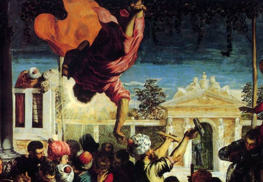 当他们挥动刀斧、锤子,即将虐杀他时,散发出耀目光辉的威尼斯守护神圣马可从天而降,以神力解救了他。