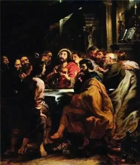 朴素版的像伦勃朗的《最后的晚餐》,大家挤在一张小桌子周围,耶稣手里举着唯一的面包,众人望天,实在有些于心不忍…