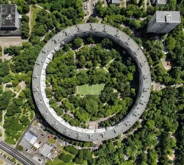 这栋楼中间还有球场,散步和停车的地方。这栋环形楼内部直径有 155 米,有 912 套住宅。