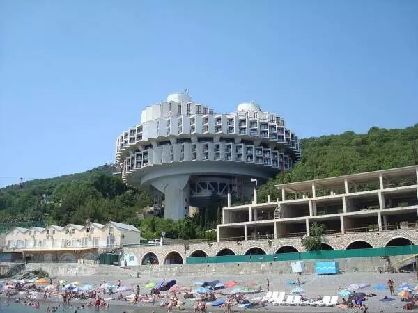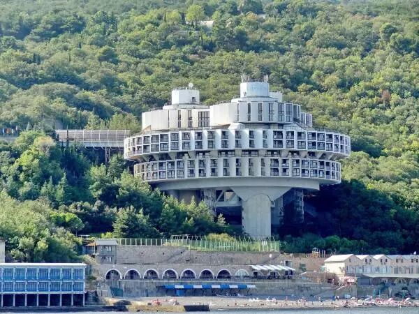 这个疗养院建在乌克兰的雅尔塔(Yalta,学过中学历史都听过这个地方吧)的海边,像一个飞碟停在一根大柱子上面,现在就是个休闲娱乐场所。