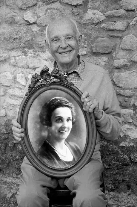 妻子弗兰克为布列松拍下他手举着母亲像的照片。