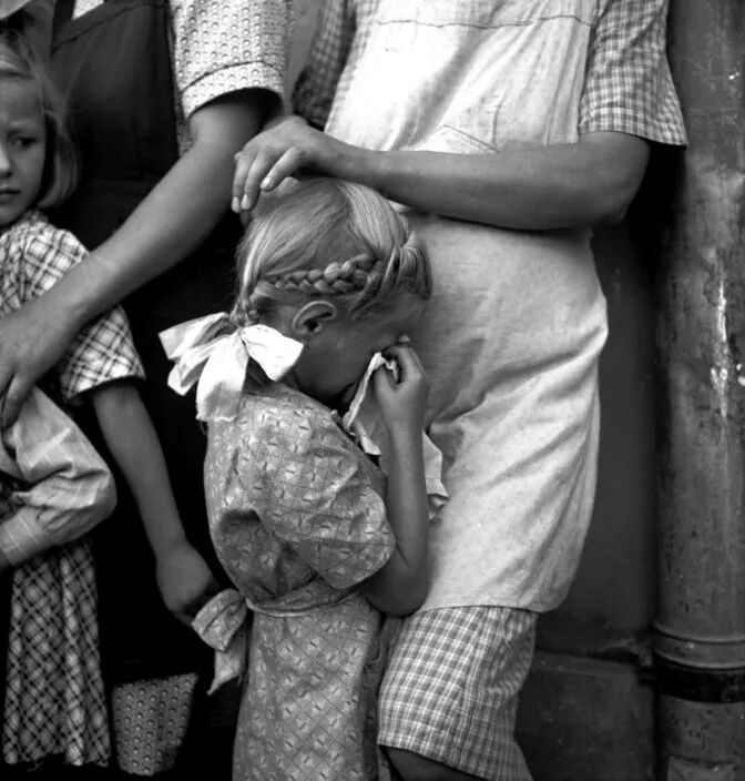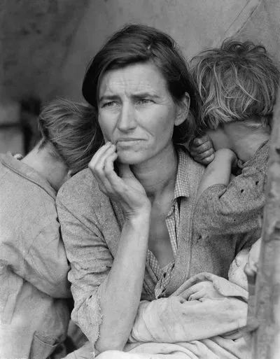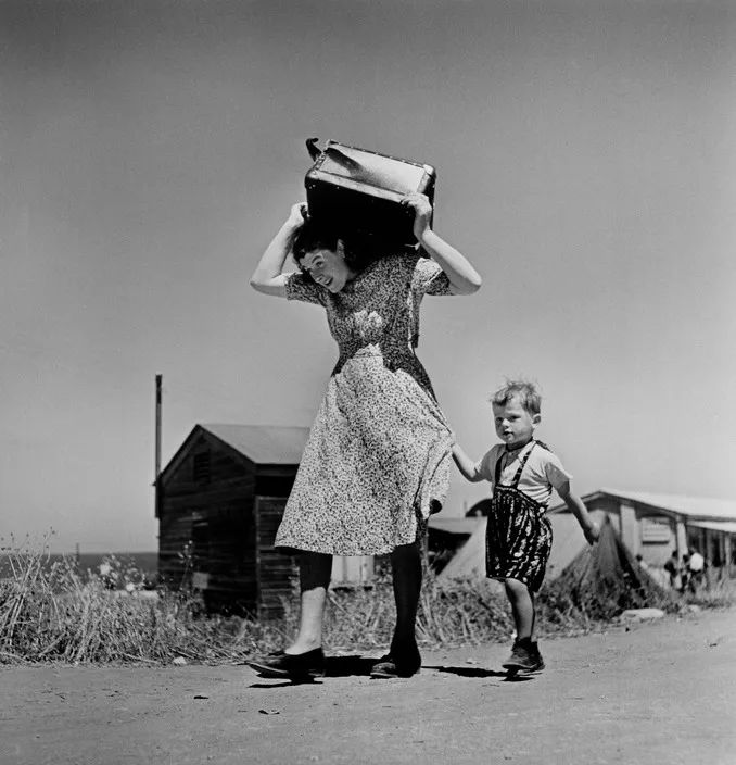 ©Dorothea Lange《迁徙的母亲》。世界上最知名的“母亲”照片之一,拍摄于1936年3月,照片中的母亲名为佛罗伦萨·欧文斯·汤姆森(1903-1983)。多萝西娅说:“这个饥饿绝望的母亲像磁铁般吸引我向她走去。我记不得是如何向她说明来意,却永远记得她一句话都没问我……她说他们一直靠附近野地里的蔬菜和孩子们抓回来的野鸟果腹。她卖掉车子的轮胎买食物。她坐在倾斜的帐篷边,孩子依偎在她身边。她觉得我的照片可能帮得了她。”