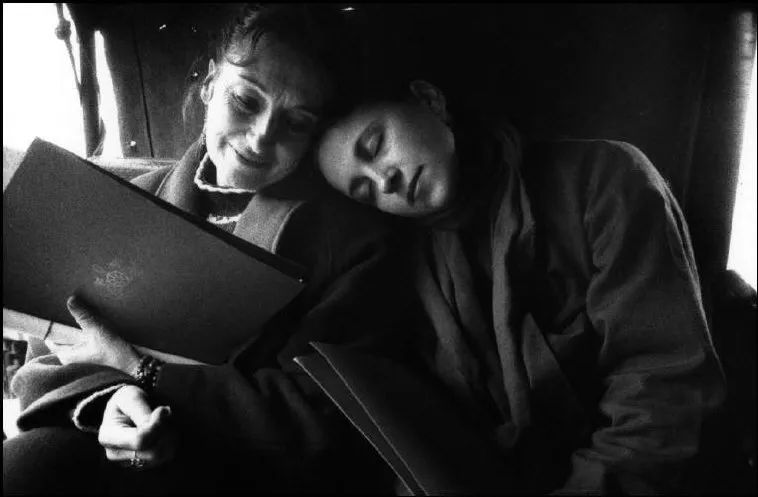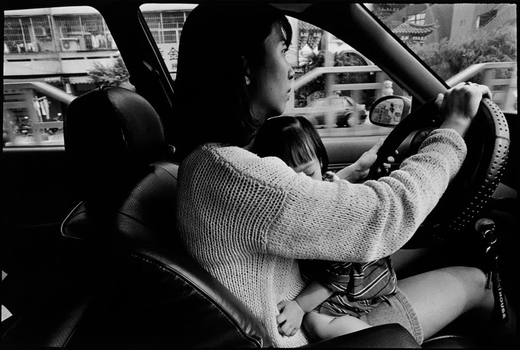 为了安抚女儿,母亲违反交通规定让女儿坐在自己腿上,1988。