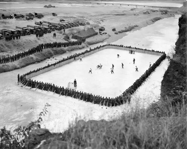 1952年朝鲜战争期间,加拿大军队在冰冻的河面打曲棍球