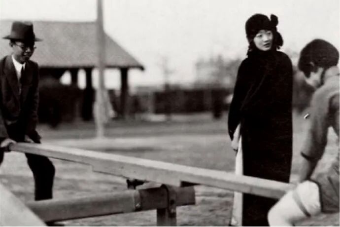 溥仪和妹妹玩跷跷板,婉容站在旁边观看。
