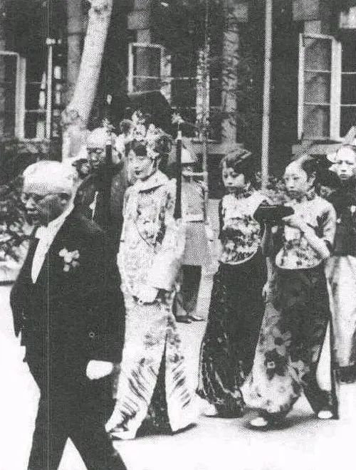 婉容会见秩父宫雍仁后步出勤民殿,跟在身后手捧大勋章的是溥仪的二妹和三妹。