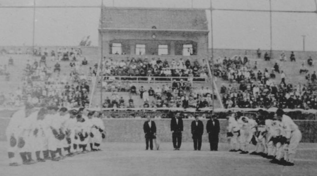 ▲1936年建成的铁东体育场,南北走向,东侧设二层楼式的主看台,两侧设有阶梯看台,台下为库房等附属设施。场内有标准式400米三合土跑道8条,渗水、排水性能良好,中间是足球场。老鞍山人都称它为“老体育场”。
