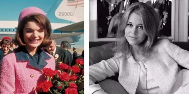 身穿香奈儿套装的第一夫人杰奎琳(左)、好莱坞影星简·方达(右)