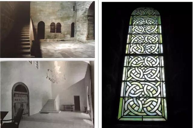 修道院(左上)、香奈儿别墅(左下)和修道院的彩绘窗(右)
