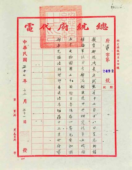 民国三十七年(1948年)12月31日的一则总统府代电,是蒋介石通知杭立武次长,已请海军派舰运送文物三千箱赴台的公文。