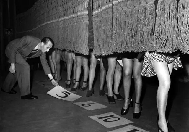 20世纪四五十年代,在一场选美比赛的后台,坐在角落的男子看着一群身着比基尼和高跟鞋的模特,等候着出场。