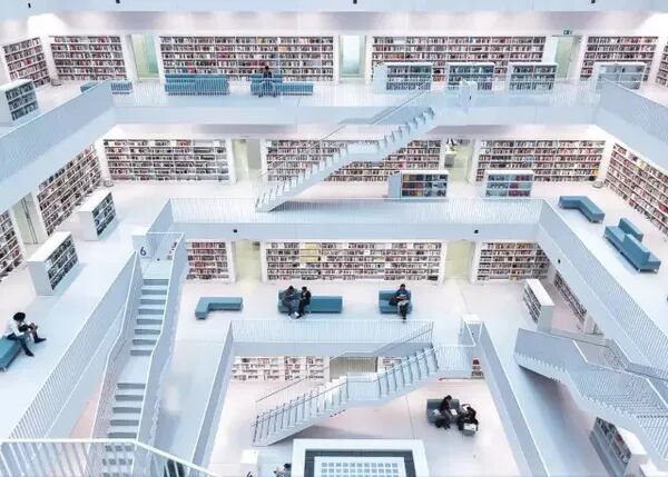 德国斯图加特图书馆,阳光倾泻而下,洒在图书馆中洁净纯白的地板、宽阔整齐的书墙、舒适开放的空间之上,尽显极净之美。