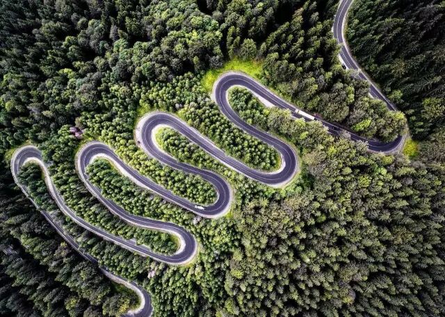 罗马尼亚,这条名为Cheis(DN1A)的公路是通往“吸血鬼故乡”特兰西瓦尼亚的必经之路,坐落在茂密的森林之中,像丝带一样蜿蜒曲折,而这张照片就是想象德库拉伯爵(吸血鬼)在飞行时所看到的景象。