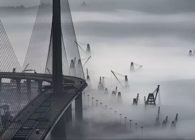 香港,冬末春初的暖风给葵涌货柜码头捎来朦胧缭绕的海雾,只有集装箱和船舶起重机能够穿过层层海雾在港口隐隐若现。