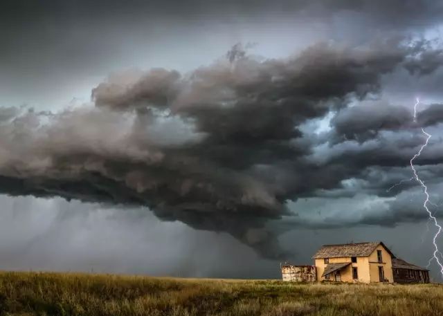 美国俄克拉荷马州西北部的一个原野上,日落时分,一道雷电从天而降,几乎打在这座孤独的乡村小屋上。
