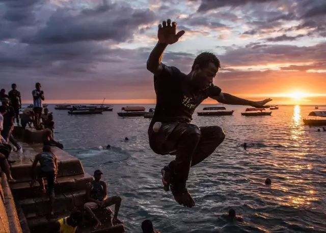 坦桑尼亚石镇,雨季非常闷热,年轻人喜欢在这样的天气里相聚在河边,成群结队地跳入凉爽的印度洋海水中。